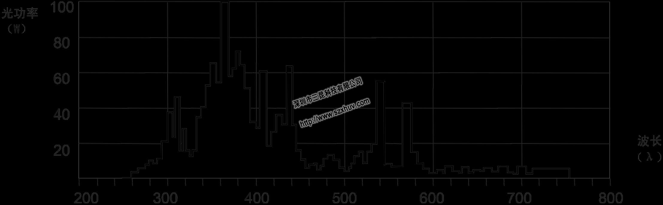 高壓汞燈可以產(chǎn)生輻射強烈的310nm 、365nm、410nm 等波長的特征紫外光(UV)、可見光及紅外光(IR)其中365nm為主峰的波長是世界各國常用的、用于固化干燥的波段(以下稱謂的"UV燈"即指365nm的高壓汞燈)。